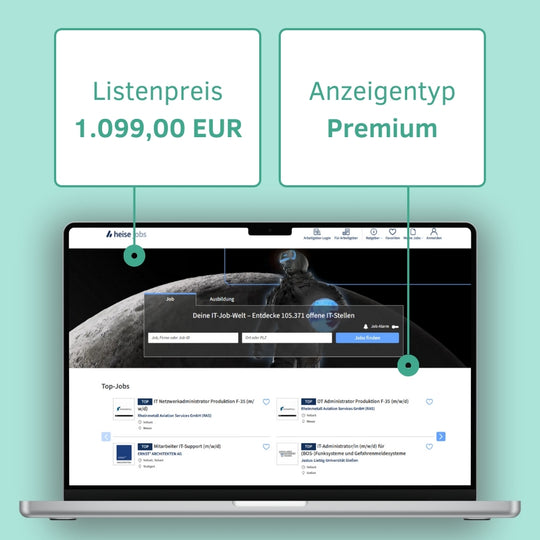 Ihre Stellenanzeige erscheint im Branchen-Stellenportal jobs.heise.de. Heise-Jobs ist das ideale Branchen-Stellenportal für IT-Jobseekers. Es bietet eine gezielte Suche nach Stellenangeboten in der IT-Branche, umfassende Informationen zu Unternehmen und Karrieremöglichkeiten sowie wertvolle Ressourcen wie Bewerbungstipps. Nutzer profitieren...Aktionspreis 595,00 EURRegulärer Preis 1.099,00 EURSchnellansicht -